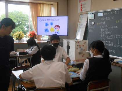 保健体育の授業は保健分野でした。「がんを予防するにはどうしたらよいか」グループごとに意見を出し合いました。