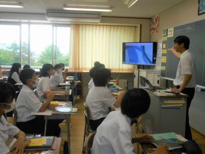 英語の授業では、画面に映し出される拡大された一部を見て、「What is this?」を使って問答をしました。このクイズが面白かったようです。