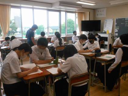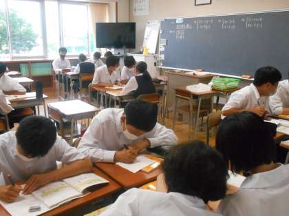 数学の授業では、連立方程式を解く練習をしました。分からないところを教え合いながら進めていました。