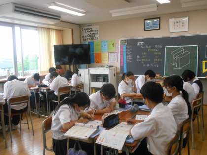 技術の授業では、キャビネット図を描きました。みんな真剣に取り組んでいました。描くことが面白かったのだと思います。