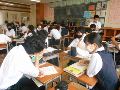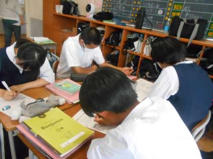 英語の授業では、「○○最長歴者」を探せ、という課題に取り組んでおり、自分が質問する事柄を班員に相談しながら決めました。どんな質問になったのでしょうか。