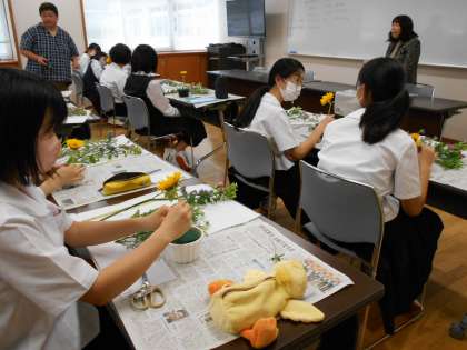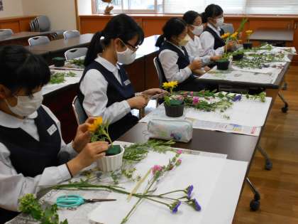 家庭・文芸部では講師の先生をお招きし、フラワーアレンジメントを行いました。「家の食卓に飾って、家族全員で楽しみたいな。」「玄関に飾ろうかな。」など、飾る場面に合わせたアレンジをしていました。