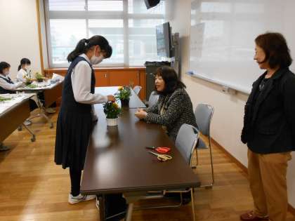 お花の名前や、フラワーアレンジのコツを教えていただきながら、1本1本の花に語りかけながら生けてる姿は真剣そのものでした。同じ花を使ったのですが、一つ一つの作品が異なっており、部員一人一人の個性が表れているようでした。