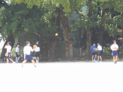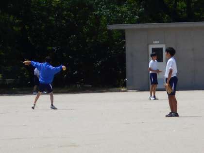 保健体育の授業はソフトボールでした。互いの距離がだんだん遠くなっており、キャッチボールも上手になってきたようです。