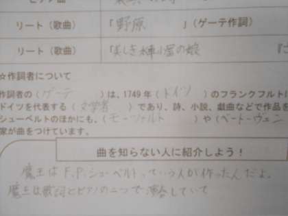 音楽の授業では、「魔王」を鑑賞して分かったことを、「魔王」を知らない人に紹介するという設定でまとめたをしました。
