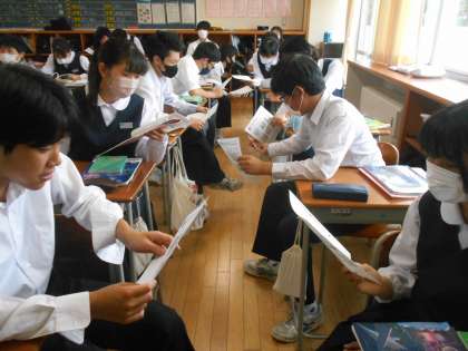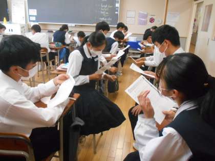英語の授業では、リスニングで聞き取った対話文を口頭練習した後、段落の内容を捉えながら読むことに取り組みました。内容が分かると読める、また、読めると内容も分かるということにつながります。