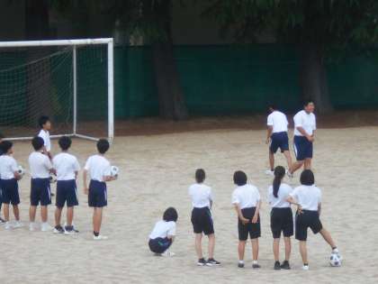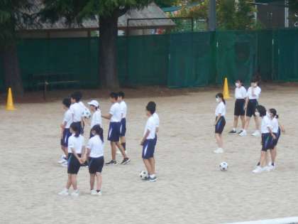 保健体育の授業はサッカーでした。技術の向上のために、級友のパスのしかたを参考にする時間もありました。