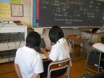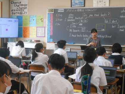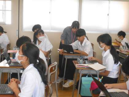 英語の授業では、プラスαの情報を加えたり、質問したりすることをイメージして、Chromebookに打ち込みました。いろいろなアイディアが集まり、それらを見るだけでも勉強になったと思います。