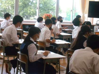 英語のテストでは、リスニングもありました。集中して聞けたでしょうか。簡単なメモを取るなどこつを身に付けていきましょう。