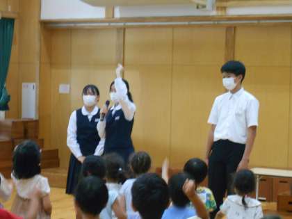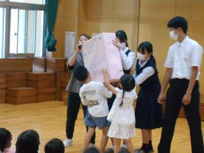 「西田地方保育園」での寄贈の様子です。こちらでは、なんとたくさんの園児の皆さんが待っていてくれており、空気清浄機を代表園児の2人に渡すことができました。その後、急遽じゃんけん大会で園児の皆さんと過ごす楽しい時間もあったそうです。代表生徒は、役に立てたことを実感でき、本当にうれしかったと報告してくれました。