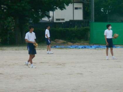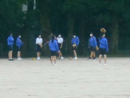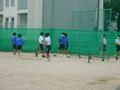 保健体育の授業では、ソフトボールの練習をしました。バックネット前にバッターが立ち、守備もそれぞれ配置についた形での練習でした。後半に急な雨が降って屋内に入ることになりましたが、試合形式の練習に入ったようです。