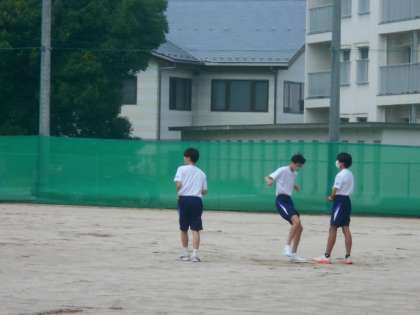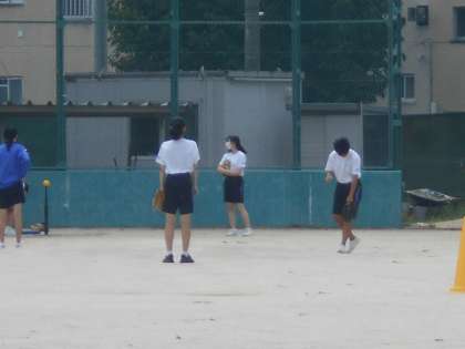 保健体育の授業では、ソフトボールに取り組んでいます。男女それぞれチームに分かれて対戦形式で練習しました。