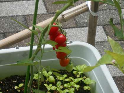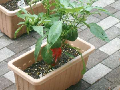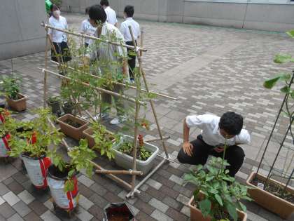授業で栽培しているプランターを使った野菜作りの様子です。ミニトマトがたわわになっていました。パプリカもようやく赤色に色づき、収穫まじかです。味のほうも楽しみですね。