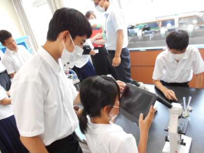一人一台端末をはじめとしたICT機器の活用した授業で、生徒は意欲的に水中生物の写真を撮り、その不思議な生態に関心をもって探究しようとしていました。