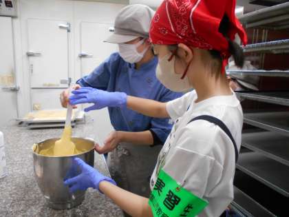 シュークリームのシュー絞りをしました。生徒は、「たまご4kgをまぜたり、生地をまぜたりするのが重くて大変です。」と体験してみての感想を聞かせてくれました。