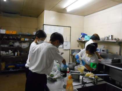 料理に使う材料を仕分けしていました。しっかりと分量を量り、こぼさないように慎重にやっていました。次にやるべきことをスタッフさんに相談しながら活動していました。生徒たちは普段やらない作業も楽しいと言って笑顔で仕事をしています。みんな上手にできていて感心ですという言葉をいただきました。