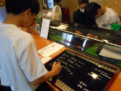 手前の生徒は今日のおすすめを手書きし、奥の生徒は甘エビの殻をむいています。接客もこなし、お客様の食べ進めている様子を確認し、次に提供するものを考えていました。まだ生徒には堅さは残るものの、がんばっているのでどんどん慣れてくると思いますという言葉をいただきました。