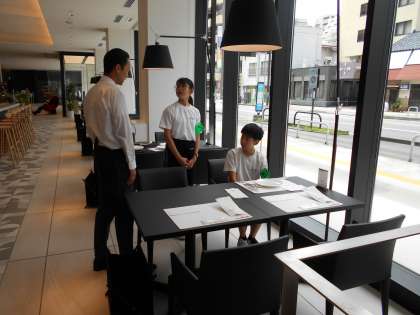 キッチン班と客室班に分かれて活動していました。キッチン班は、レストランでカトラリーの扱い方を習っていました。生徒はとてもよい姿勢で、真剣に説明を聞いていました。客室班は、ベッドメイキングとアメニティの補充をしていました。「ベッドメイキングは難しい。」とシーツを丁寧に直していました。