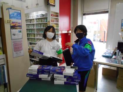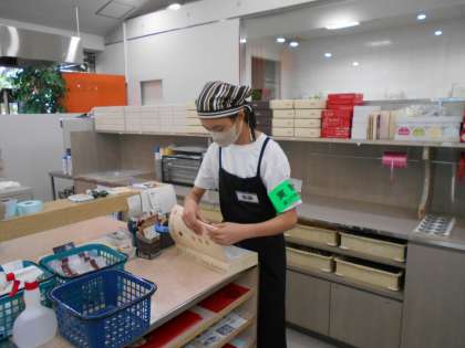 壁一面のガラスを大きく手を伸ばして磨いたり、菓子箱を丁寧に折ったりしていました。きめ細やかな指導を真剣に聞く態度や黙々と作業する姿に、指導ボランティアの方々から、「真面目に丁寧に活動してくれています。」とおほめの言葉をいただきました。
