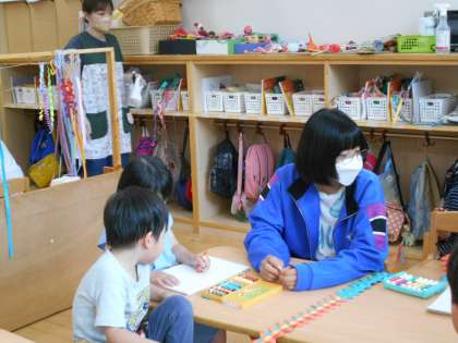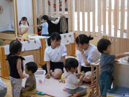 子どもたちに寄り添い、その子のペースに合わせて遊んでいました。また、ブルーシートの清掃や窓拭き等、環境整備に取り組んでいることも指導ボランティアの方から教えていただきました。どの生徒も積極的に子どもたちに話しかけてくれたり、抱っこしてくれたりする姿がとてもよかったとほめていただきました。