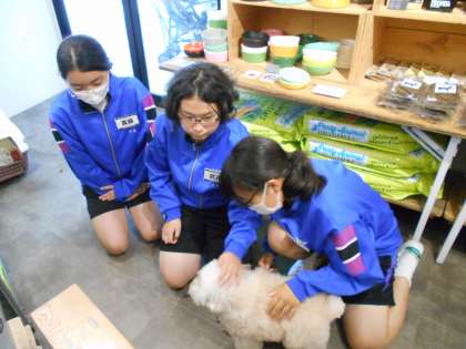 オンライン販売用品の箱詰めやドッグトレーニングの説明、見学、清掃等を行いました。生徒たちは、従業員の方々が楽しいと感じながら働いておられるところが素敵だと感じていました。