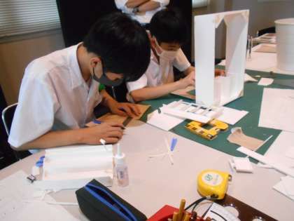 設計図をもとに模型を製作していました。指導ボランティアの方によると、この数日で自分たちで考え、協力し、お互いに指示を出し合いながら作業できるように変化してきたとのことでした。