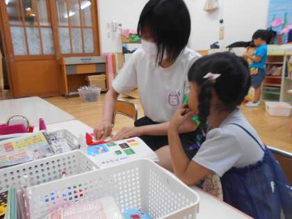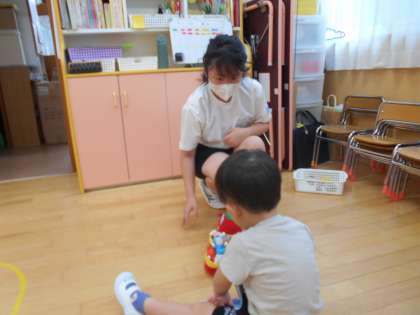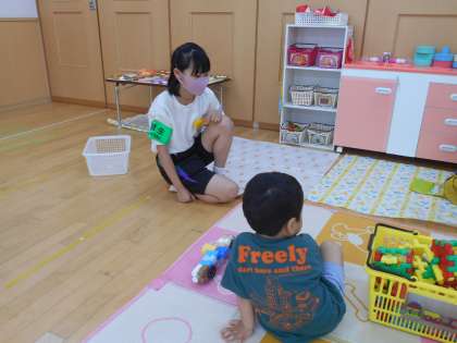 子どもと一緒に折り紙やブロック、人形で遊んでいました。生徒たちは、緊張が続いているとのことでしたが、子どもたちは中学生先生になついてくれているようでした。