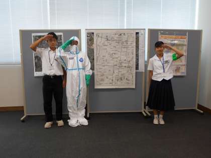 ハザードマップを作成していました。班長を中心に避難場所を探していました。また、防護服試着体験も行いました。生徒は「この服を着ながら走ったり作業したりすることがかなり大変そう」と感想を述べていました。