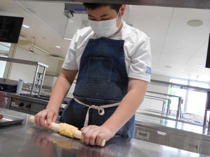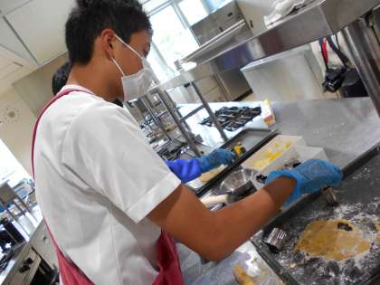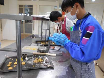 青池学園での調理実習体験で、クッキーの型抜きとカクテル作りをしました。型が柔らかく苦戦していましたが、何とか焼き上げたクッキーを「写真撮ってください!」と嬉しそうに見せてくれました。自分たちのために準備や片付けをしてくださった方々に感謝を込めて挨拶していました。