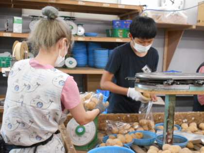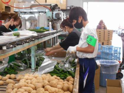 手を休める暇がないくらい次々と運ばれてくる野菜を袋詰めしていました。指導ボランティアの社長さんから、「仕事をするときには、忍耐力と考える力が必要だ。」と教えていただいたそうです。