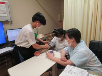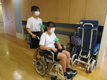 血圧や酸素濃度の測定実習、車椅子や歩行器の体験、患者さんがする体操の体験、透析の道具の実習等、様々な体験のさせていただきました。生徒は、「医療従事者が、様々な場面で患者さんに関わっていることや清掃等、直接患者さんに関わっていなくても気を配っていることが分かり、すごいと思った。」感想を聞かせてくれました。