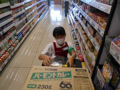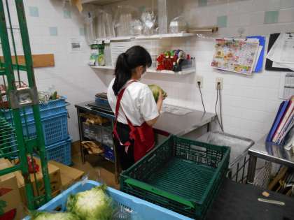 バックヤードで野菜を詰めたり、陳列棚で食品の補充をしたりしていました。慣れた手つきで作業をこなしています。生徒は「仕事は楽しいです」と感想を述べてくれました。