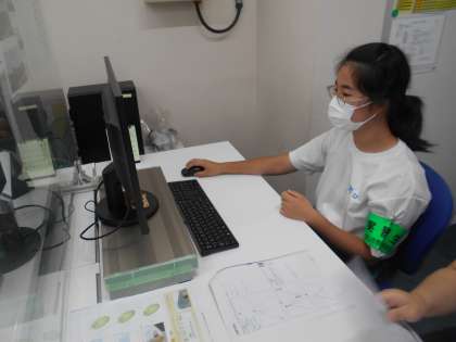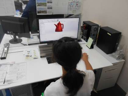 製造工場で商品開発の体験をさせていただきました。コンピューターを使って、3Dスケッチに挑戦していました。生徒は、指導ボランティアの方とのガイダンスで、熱心にメモをとりながら話を聞き、仕事のやりがいについて質問していました。