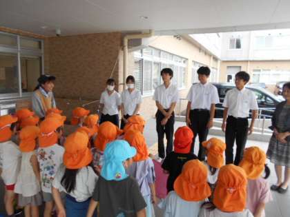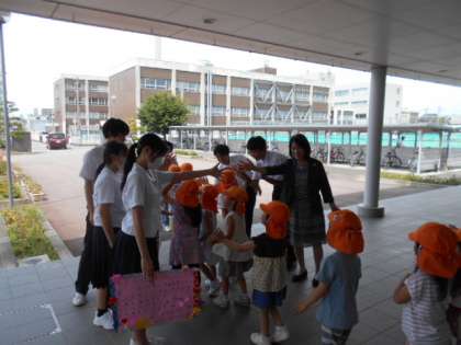 先月、西田地方保育所に空気清浄機1台を寄贈したお礼ということで、かわいらしい園児の皆さんが本校まで来てくれました。すてきなお手紙とともに、園児の皆さんから「空気清浄機を届けてくれてありがとう」とうれしい言葉をもらいました。受け取った生徒会執行部の皆さんは、かわいらしいお客さんにはじける笑顔で応えていました。最後はハイタッチでお別れしました。園児のみなさん、そして、先生方、どうもありがとうございました。