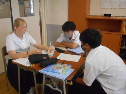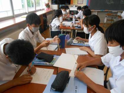 技術の授業では、1リットルのペットボトルを乗せても崩れない台を割り箸をいかに組み立てて作るかを考えていました。難しい課題ですが、アイディアを持ち寄って乗り越えましょう。
