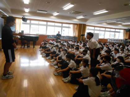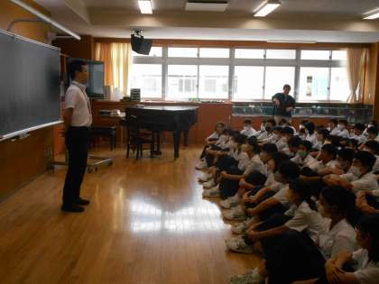 音楽室で行われた学年集会の様子です。先生方一人一人からのお話の後、質問コーナーがあり、大いに盛り上がっていました。ほのぼのとして楽しい時間になり、笑顔一杯でした。