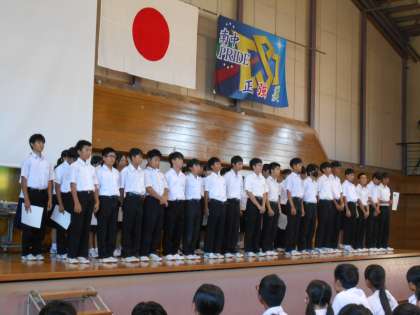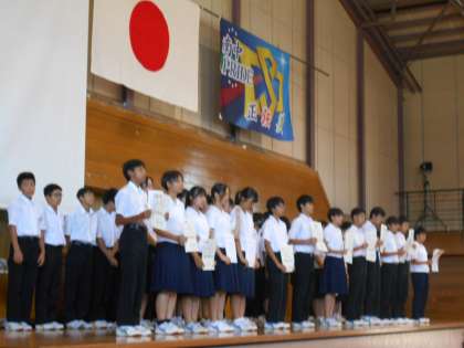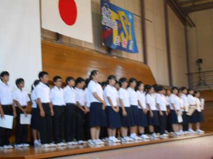 1学期の各種大会等で表彰された団体・個人の受賞報告が行われました。生徒の皆さんが非常に多く優秀な成績を収めていることを大変嬉しく思います。日頃の成果が身を結びましたね。