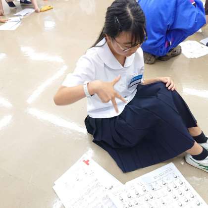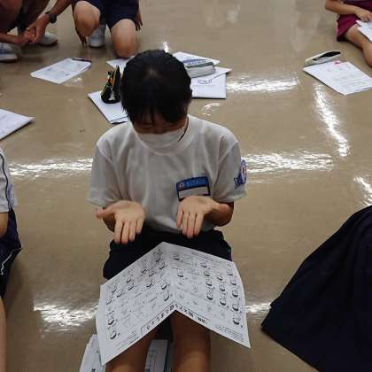 「手話」の時間では、手話協会の方々から自己紹介の仕方や「夕焼け小焼け」を手話で表現することを教えていただきました。自分の名前をグループで見せ合うなど、他校の生徒のみなさんとのよい交流の場となっています。また、2日間の活動を通して、自ら考えて動く、気付いたことをやる。そんなリーダーとしての資質も自然に磨かれているようです。