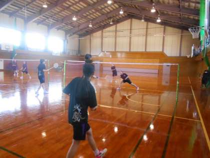 女子バドミントン部の様子です。Tシャツに書かれた「必勝」の文字が、気合いを感じさせます。