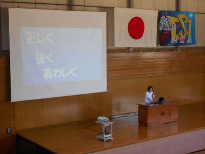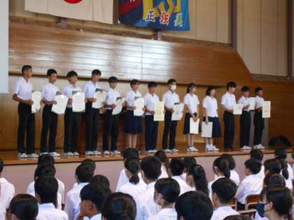 受賞報告では、陸上競技部の大会や剣道の昇段のほか、ソフトテニスやフェンシング等部活動外の活動で収めた成績も紹介されました。夏休みの部活動は猛暑の中様々な工夫をして行いましたが、その成果が9月の新人大会で生かされることを願います。