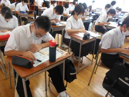 今日は2学期の始業式がありました。学活の時間には2学期の目標を書きました。「復習に力を入れたい」「計画的に学習に取り組みたい」など、受験生として特に学習面においての強い意気込みが感じられました。2学期も学校行事、生徒会活動、学習等様々な場面での3年生の活躍を期待しています。