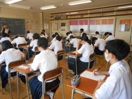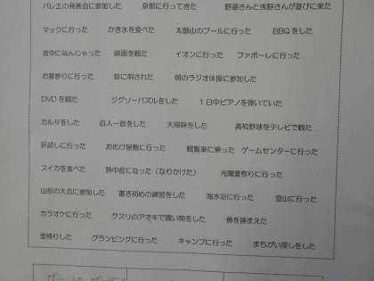 担任の先生の夏休みの出来事をビンゴゲーム形式で当てるゲームに取り組んでいました。このクラスでは、書き出された事柄は、クラスの誰かが夏休みやったことと担任の先生がしたことをミックスして書かれており、担任の先生だったらと考えて選ぶことがまず必要でした。ビンゴになったでしょうか。