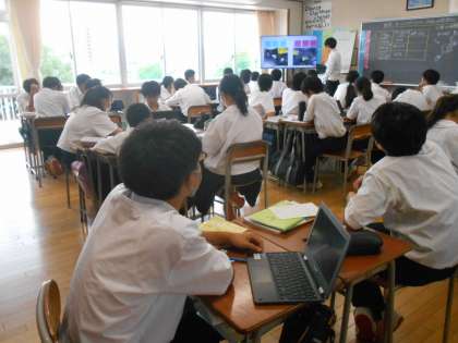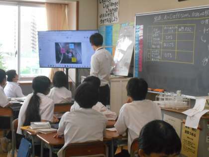 理科の授業では、写真に収めた各班の実験結果をモニターで確認しながら、白い粉の正体に迫りました。