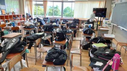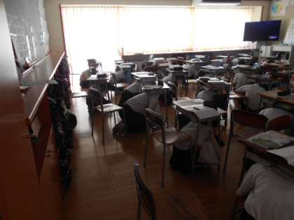 本校では帰りの会の時間に、シェイクアウト訓練が行われました。生徒たちは、放送で指示があると素早く体勢を低くして机の下に入り、身を守る姿勢をとっていました。自分や家族の命を守るため、今後も防災に対して高い意識をもってほしいと思います。