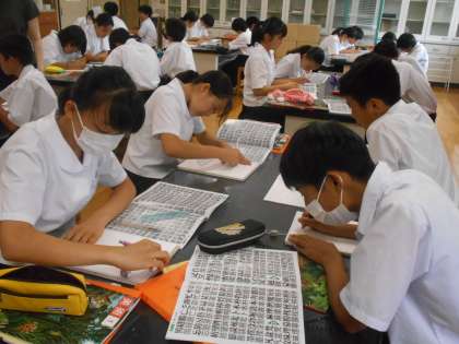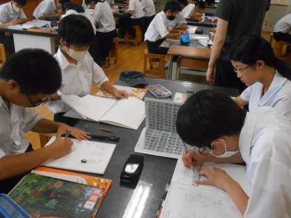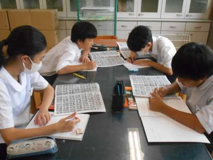 美術の授業では、漢字の意味を楽しく伝えることに取り組んでいます。デザインする文字が決まり、下書きを進めていました。