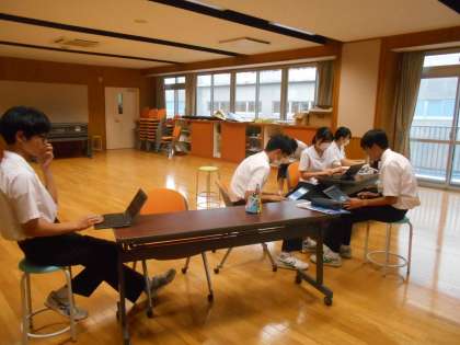 執行部の皆さんは、前期生徒会報告会に向けて、Chromebookでスライド作りの真っ最中でした。半年間、たくさんの活動を牽引してきましたね。もう一息よろしくお願いします。