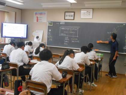 数学の授業では、1次関数「y=ax+b」のグラフが直線であることについて勉強しました。みんな真剣そのものです。
