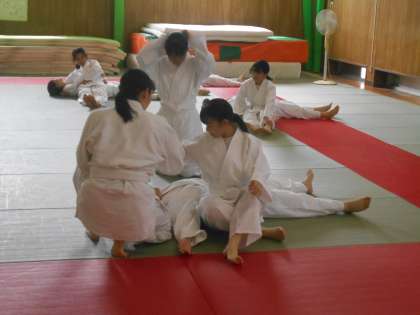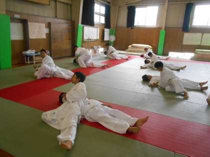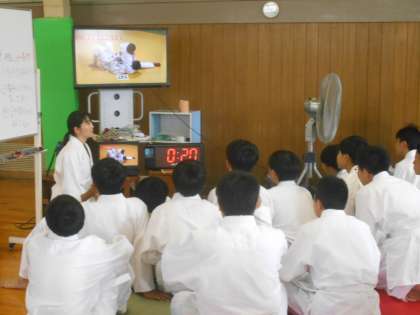 保健体育の授業では、柔道のけさ固めに取り組みました。まず、映像でやりかたを確認してから、実際にやってみました。やってみるとなかなかきれいに形が決まらないようでした。