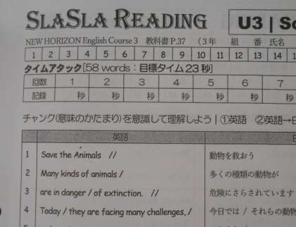 英語の授業では、音読練習用のSLA SLA READINGというシートを作成し、区切って読むことを意識して練習しています。