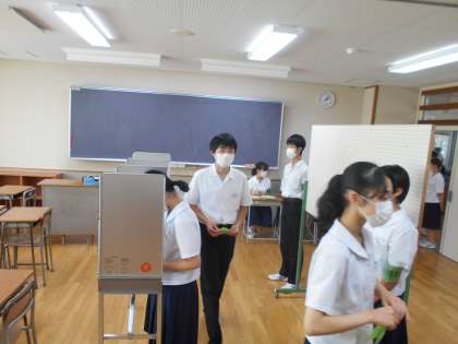 本校の投票で使用される投票箱及び記載台は、実際の選挙で使われているものです。生徒たちは緊張しながらも、自分たちの学校のために真剣に考えて投票していました。今後、生徒会活動がますます充実したものになることを願います。
